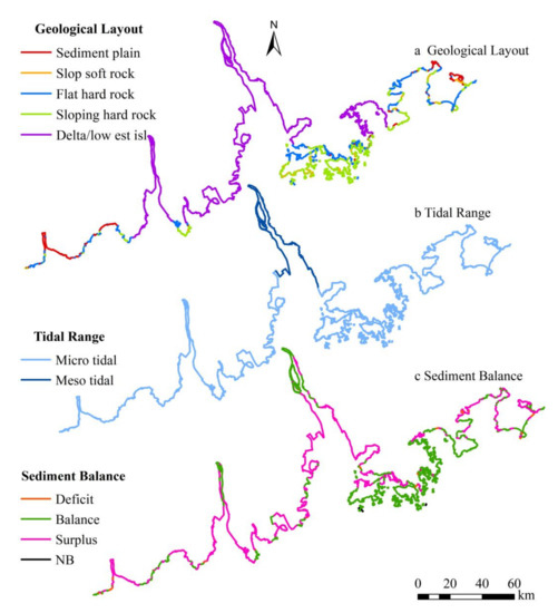 Main input layers of GBA in 2020 for CHW. (a) Geological layout (b) tidal range map (c) character of sediment balance.
