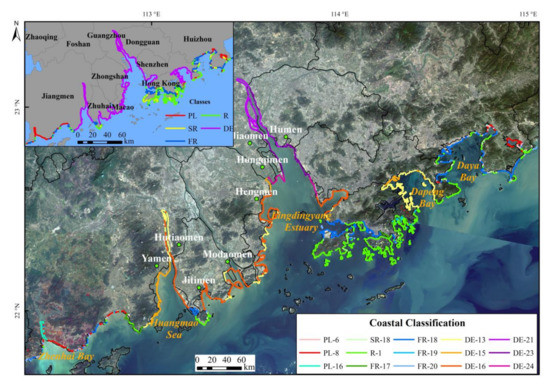 - Su, Q.; Li, Z. Coastline Types and Their Spatiotemporal Variations in Guangdong, Hong Kong and Macao Bay Area (1979–2020). Digit. J. Glob. Chang. Data Repos. 2021. [Google Scholar] [CrossRef]
