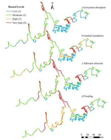 The CHW framework is provided as a graphical tool to facilitate its application for planning purposes. CHW 3.0 is represented by a disk and consists of six indicators: geological layout, wave exposure, tidal range, vegetation, sediment balance and storm climate. Starting from the center of the disk, each index was classified sequentially, which could be divided into 131 coastal environments and scenarios. Then, according to the divided coastal types, the vulnerability of ecosystem disruption, gradual inundation, salt water intrusion, erosion and flooding hazard in the corresponding region was assessed, and each hazard was divided into four levels: low, moderate, high and very high (Figure 2).