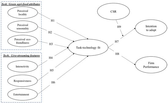 In recent years, TTF theory has been widely used in the study of new technology adoption willingness, such as e-commerce, Internet of Things, AI, cloud mobile services, and so on [23,24,25,26,27,28,29]. TTF theory demonstrates a good explanatory capability in explaining the TTF and technology adoption. This study uses TTF theory to explain and analyze the fit between the marketing characteristics of green agri-food and the technology of livestreaming e-commerce and to understand the effect of the fit on firm performance and intention to adopt. Considering that the livestreaming technology is provided by a third-party e-commerce company. The study adds CSR as a moderating variable based on the original TTF model framework to investigate how an e-commerce company would fulfill its CSR by livestreaming green agri-food. Figure 1 presents the theoretical model upon which this empirical study is based.