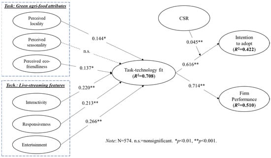 Following the measurement model estimation, we empirically tested the theoretical model and the hypotheses. Figure 2 presents the results of the structural equation modeling analysis. Following Chin’s (1998) approach [94], we estimated the coefficient of determination R2 and the path coefficient with their respective t-values. The R2 values for the three endogenous variables (e.g., task–technology fit, intention to adopt livestreaming services, and firm performance) indicate satisfactory explanatory power for our model (0.422–0.708). Overall, the results presented in Figure 2 indicate that the constructs are largely related in the theoretically predicted manner. Specifically, the results show a significant positive relationship between the two features of agricultural products, that is, perceived locality (b = 0.144, t = 3.475, p < 0.01), perceived eco-friendliness (b = 0.137, t = 2.640, p < 0.01), and TTF for rural e-commerce entrepreneurial farmers who are using livestreaming to reach consumers and to sell their agricultural products, such as fruits and vegetables, in China. We also find corroborating evidence of a positive and significant relationship between three features of livestreaming services, that is, interactivity (b = 0.220, t = 4.327, p < 0.001), responsiveness (b = 0.213, t = 4.484, p < 0.001), entertainment (b = 0.266, t = 4.632, p < 0.001), and task–technology fit for rural e-commerce entrepreneurial farmers who are using livestreaming. Therefore, these results indicate that the perceived locality and eco-friendliness features of agricultural products, and the features of livestreaming services (i.e., interactivity, responsiveness, and entertainment), as hypothesized, are key determinants of the technology appropriateness for rural e-commerce entrepreneurial farmers to reach consumers and market their agricultural products through livestreaming. These results support Hypotheses 1, 3, 4, 5, and 6. However, the perceived seasonality of agricultural products does not have a significant effect on the task–technology fit (b = 0.065, t = 1.652); hence, Hypothesis 2 is rejected.