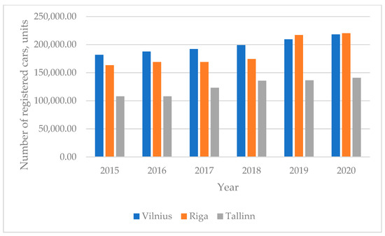 The number of registered cars is growing every year (see Figure 1). Having compared 2020 to 2019, an increase of 2.5% has been noticed in Tallinn, 2.23% in Riga, and 2.36% in Vilnius.