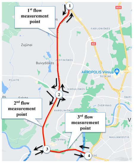 Having performed the measurements, the data were converted into the amount of car traffic per hour. Traffic flows in both directions of the bypass were determined. The data obtained are presented in Table 2 and Table 3. The distance between points was found to be 1–2 is 6.6 km, between 2–3-3.9 km, between 3–4-2.1 km, and a total of 12.6 km. When driving through the city streets (Geležinio Vilko St. or Ukmergė St.), we will obtain the distance of 13.3 km between the end points.