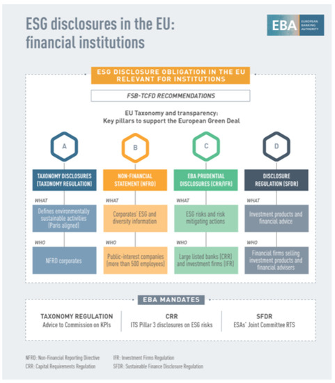 - Consultation Paper on Draft ITS on Pillar 3 Disclosures on ESG Risks. Available online: https://www.eba.europa.eu/sites/default/documents/files/document_library/Publications/Consultations/2021/Consultation%20on%20draft%20ITS%20on%20Pillar%20disclosures%20on%20ESG%20risk/963621/Consultation%20paper%20on%20draft%20ITS%20on%20Pillar%203%20disclosures%20on%20ESG%20risks.pdf (accessed on 14 October 2021).