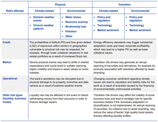 Furthermore, the Single Supervisory Mechanism (European Central Bank), the supervisory authority of the significant banks of the 19 Eurozone countries, has issued its own guide on climate and environmental risks in which it sets out the expectations with regard to the management of such risks and the related disclosure to investors [28]. The table below (Figure 3) shows the main impacts on the various risk categories highlighted in the guide issued by the European Central Bank.