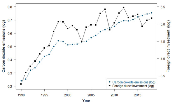 Average evolution of the CO2 and FDI in the period of 1990–2018 (source: authors with World Bank [68] data).