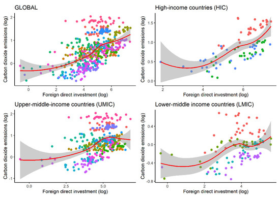 On the other hand, through an autoregressive distributed delay (ARDL) model for six sub-Saharan African countries, some findings [27] support the EKC in the cases of the Democratic Republic of the Congo, Kenya, and Zimbabwe. Furthermore, the FDI appears to increase CO2 emissions in some countries, while the opposite impact can be observed in others. On the other hand, in the region of South and Southeast Asia (SSEA) during the period of 1980–2012, the most recent evidence [28], through cointegration techniques for subgroups according to income level, found that FDI entries and CO2 emissions are co-integrated in all subgroups of countries. In addition, the results reveal that FDI inflows are substantially positively affecting CO2 emissions. On the contrary, in the Economic Community of West African States (ECOWAS), the large amount of FDI towards the oil, mining and agriculture sectors, has put strong pressure on the environment [29].