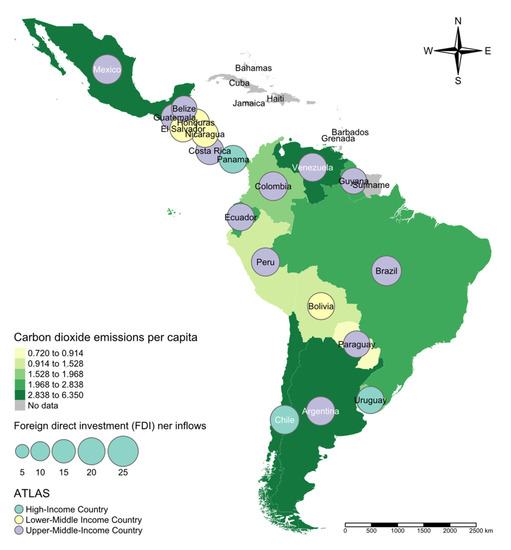 The sample of countries for the study was classified according to the atlas method of the World Bank [13], which is based on the gross national income per capita (GNI) Of each country. The groups of countries according to the method were classified into high-income countries (HICs) ($12,696 USD or more), upper-middle-income countries (UMICs) ($4096 USD and $12,695 USD), and lower-middle income countries (LMICs) ($1045 USD and $4095 USD). In the econometric regressions, the dependent variable is per capita CO2 emissions and the independent variable is per capita FDI inflows.