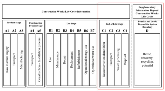 - Trinius, W.; Sievert, J.; Schmincke, E.; Grootens, F.; Pankow, N.; Untergutsch, A.; Görke, J.; Werner, F.; Lützkendorf, T.; Passer, A. TEXTE 130/2020: Basic Principles and Recommendations for Describing the Dismantling, Post-Use and Disposal Stage of Construction Products—A Guidance Document for the Construction Product Industry and Standardization Bodies for the Design of Modules C and D in EPD and PCR. Project no 3714 95 309 0. German Environmental Agency: Des-sau-Rosslau, Germany. Available online: https://www.umweltbundesamt.de/publikationen (accessed on 8 May 2021).
