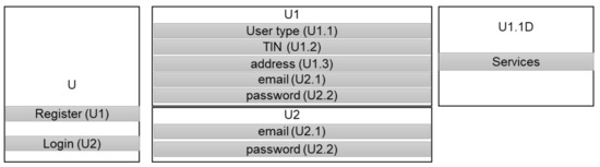 In this section, the functioning of the online platform that is supported by the database that we have developed will be described. This includes all of the operations which must be completed by the user, and in particular its registration. To access the online platform, it is necessary to register the user (U1) on the home page (U). This record consists of the identification of the type of user (designer, builder, owner, or CDW operator) (U1.1), their TIN (U1.2), their address (U1.3), and the definition of the login elements (e-mail (U2.1) and password (U2.2)). In the case of the waste operator, a new window will open with a request for confirmation of the services that they perform (U1.1D). The platform manager validates all registrations and give access to the corresponding functionalities according to the type of user. Designers, contractors, and construction owners will have access to the Generator (B) and Consumer (C) profiles, while waste operators will have access to the Operator page (D). In the case of users who are already registered, access to the database requires that they log in (U2) using the email (U2.1) and password (U2.2) that were already defined during their registration (Figure 4).