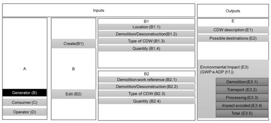 In the case of the generator profile (B), two options are given: create demolition work (B1), or—for users who have already created a demolition task in the database—edit demolition work (B2). After selecting the option to create demolition work (B1), a new page opens, where the user fills in the location (B1.1), the demolition scenario, whether the demolition is traditional or deconstructive (B1.2), and the type (B1.3) and the quantity (B1.4) of generated CDW. After selecting the option to edit work (B2), a new page opens, where the user chooses the demolition work where the CDW is being generated (B2.1). The user must then select the type of waste-generating activity, i.e., traditional demolition or deconstruction (B2.2), and the type (B2.3) and the quantity (B2.4) of generated CDW. From the information provided by the user, the description of the CDW (E1), the possible destinations (E2), and the corresponding environmental impacts (E3) are presented. The environmental impacts are quantified through GWP and ADP (f.f.) indicators and associated with the type of demolition (E3.1), transport for treatment plant (E3.2), processing of CDW (E3.3), avoided impact (E3.4), and total environmental impact (E3.5) (Figure 5).