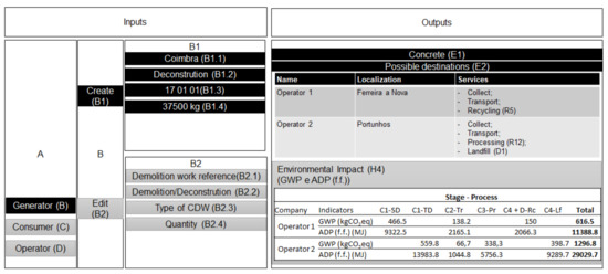 In the database development, the audience is divided into three types of users: consumers, generators, and CDW operators. Inputs and outputs are different for each profile, as described in Table 1. They are essentially focused on: (i) the CDW’s type, produced or requested (identified by the EWC); (ii) the identification of the recovery processes, used or available for use, according to Directive 2008/98/EC [20]; and (iii) the environmental impacts associated with user’s choice—GWP or ADP (f.f.).