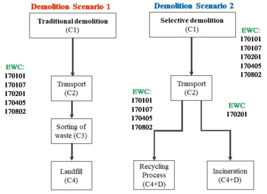 LCA is a methodology that serves to assess the potential environmental impacts of a given system or product, considering energy and reagent consumption, as well as emissions, throughout its whole lifecycle [3]. Although the standards in force in Europe, EN 15804:2012+A2:2019 and EN 15978 [12,13], already define the different phases of a building’s lifecycle, it is difficult to find studies that include all stages, and in particular the end-of-life stage. This is because the high level of uncertainty in the processes that will be used to dismantle buildings in the distant future makes outcomes difficult to predict [14,15,16,17], with a lack of data on the demolition, recovery, and recycling of materials [14]. Without information on the end-of-life phase of construction products, neither alternative impacts nor the end-of-service life of buildings can be accurately modelled, which makes the planning of recyclable and eco-efficient construction work complicated [18].