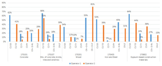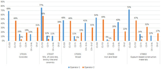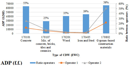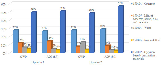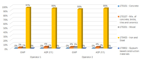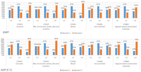 In the case of the environmental impact for each indicator in stages C1, C2, and C4, it is possible to observe that, for most situations, the operator 1 option has lower environmental impact than operator 2, with the exception of transport, since operator 2 is located at about half the distance of operator 1. It is also possible to identify that stage C4 presents high differences in environmental impact for both indicators between both operators. At this stage, disposal by landfill substantially increases the environmental impact across both indicators compared to recycling. In the case of the GWP indicator, the CDW with the smallest difference at this stage is 170405, because the impact associated with disposal by landfill is similar to the impact associated with recycling it, while the one with the greatest difference is 170201. This difference is related to the fact that the impact of wood landfill is much greater than the impact associated with its incineration. Unlike the GWP indicator, for the ADP (f.f.) indicator the CDW with the smallest difference among the processes for this stage is 170201, because in this indicator the difference between the impact of wood landfill is similar to the impact associated with incineration. Moreover, the CDW types that present the greatest differences are 170101 and 170107, because in both CDW types the impact associated with disposal by landfill is far greater than the impact associated with its recycling. This analysis is performed taking into account only the weight of the environmental impact of each process at each stage per waste type (Figure 14).