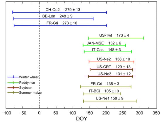 The length of the growing season of winter wheat, paddy rice, soybean and summer maize at the representative sites (refer to Table 1). Negative DOY represents days of the previous year. (The duration of the growing season at each site was investigated from literature reviews and private inquiries).