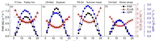 Hourly averaged daytime GPP, PAR and ELUE during the growing seasons were shown in Figure 2a–d. A trough of ELUE occurred at around noon and peaks appeared at sunrise/sunset. ELUE varied from 0.07 to 0.13, 0.04~0.10, 0.07~0.14 and 0.05~0.10 mol C MJ−1 in rice, soybean, maize and wheat fields, respectively. A synergistic relationship was found between GPP and PAR, of which the trends were opposite to ELUE. Evrendilek and Ben-Asher (2008) found that leaf LUE exhibited a bimodal behavior, which peaked in the early morning and late afternoon in wheat fields []. The midday depressions in net CO2 assimilation have been reported because stomatal control of photosynthesis results from high Ta or VPD []. Besides, the assimilation of 1 mol of CO2 requires 8 moles of photons at the leaf scale under ideal conditions []. However, the measured ELUE values are much lower than the theoretical ELUE values because they are constrained by many photosynthetic reactions [,]. Photosynthetic productivity usually saturates far below the maximum solar light intensity; in those conditions, many absorbed photons and the resulting electronic excitations of the pigment molecules can no longer be utilized for photosynthesis. To avoid photodamage, various protection mechanisms are induced that dissipate excess excitations, which otherwise could lead to the formation of harmful molecular species such as singlet oxygen. For example, non-photochemical quenching (NPQ) of chlorophyll fluorescence is thought to be an indicator of an essential regulation and photoprotection mechanism against high-light stress in photosynthetic organisms []. Ventre-Lespiaucq et al. (2018) revealed that the depression of light interception is a strategy for avoiding the interception of excessive irradiance on whole-crown and leaf scales []. These processes may be the other reasons causing a decline in ELUE at midday.