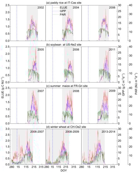 Seasonal variations of gross primary production (GPP), photosynthetic active radiation (PAR) and ecosystem light use efficiency (ELUE) in the representative site of (a) paddy rice (IT-Cas), (b) soy-bean (US-Ne2), (c) summer maize (FR-Gri), (d) winter wheat (CH-Oe2). The grey area is marked as the growing season of the crops in the four typical sites. DOY is the day of the year. The vertical dotted line indicates the start of the year.