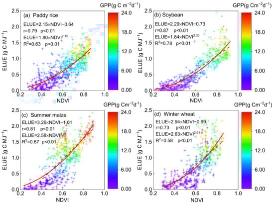 The relationship between ecosystem light use efficiency (ELUE) and normalized difference vegeta-tion index (NDVI) on a daily basis on non-rainy days at the (a) paddy rice, (b) soybean, (c) summer maize and (d) winter wheat fields. The correlation coefficient (R2) and Pearson’s correlation coef-ficient (r), as well as the exponential and linear function, are also shown. The color of the cross symbol showed the level of daily gross primary production (GPP).