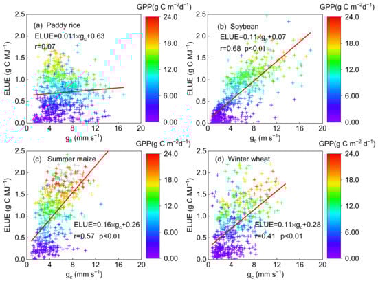 The relationship between daily ecosystem light use efficiency (ELUE) and canopy conductance (gc) on a daily basis on non-rainy days at the (a) paddy rice, (b) soybean, (c) summer maize and (d) winter wheat fields. The color of the cross symbol showed the level of daily gross primary produc-tion (GPP).