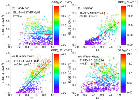 ELUE was significantly correlated to EF in the soybean (r = 0.83, p < 0.01), maize (r = 0.74, p < 0.01) and winter wheat (r = 0.37, p < 0.05) fields (Figure 6a–c). It was noted that ELUE had a negative relationship with EF in the rice fields (r = −0.07, Figure 6d). A similar relationship between GPP and EF was shown in Table 3. Such results indicated that water availability might not be a limiting factor in the photosynthetic process in long-term flooded paddy rice croplands.