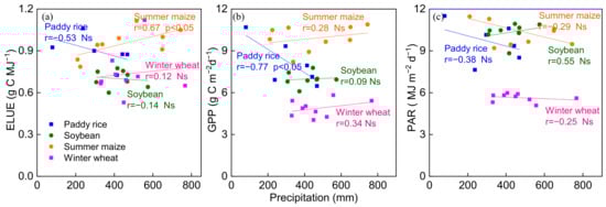 Relationships between the total precipitation and (a) ecosystem light use efficiency (ELUE), (b) gross primarily productivity (GPP) and (c) photosynthetic active radiation (PAR) during the crop growing season at the four agroecosystems. Ns represents that the trend is not significant.