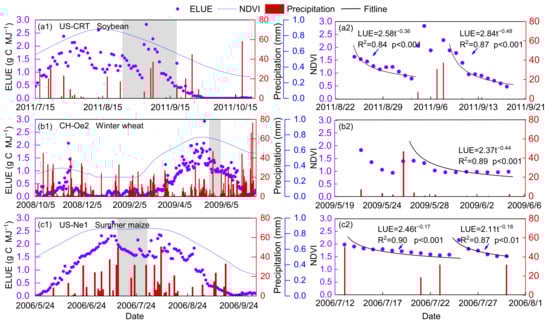 The seasonal variation of ecosystem light use efficiency (ELUE) at a representative site of soybean (a1,a2) (US-CRT), (b1,b2) winter wheat (CH-Oe2) and (c1,c2) summer maize (US-Ne1). Series 2 is an enlarged part of the gray shade of Series 1. Bar plots show precipitation. The equations inserted in Series 2 show the ELUE variation with the number of days after a certain precipitation event.