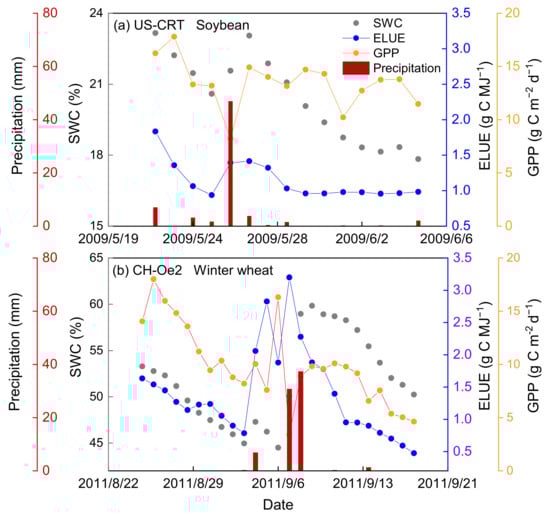 The variation of soil water content (SWC), ecosystem light use efficiency (ELUE) and gross primary production (GPP) after precipitation at a representative (a) soybean site (US-CRT) and (b) winter wheat site (CH-Oe2).