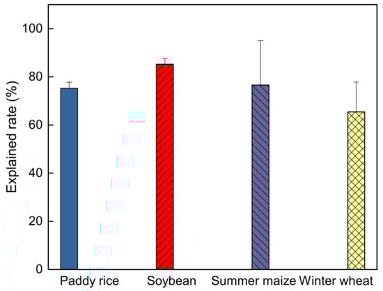 The path analysis showed that the controlling variables considered in this study can account for 73.7%, 85.3%, 75.3% and 65.5% of the total ELUE variation (Figure 10), while relative effects of unconsidered variables on ELUE (i.e., nutrition content in soil/leaf, CO2 concentration, etc.) still accounted for 26.3%, 14.7%, 24.7% and 34.5% in the rice, soybean, maize and winter wheat fields, respectively.