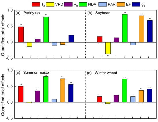 The standardized total effects of the controlling variables on ELUE. Rn, PAR, Ta, VPD, NDVI, gc and EF are net radiation, photosynthetically active radiation, air temperature, normalization difference vegetation index, canopy conductance and evaporation fraction, respectively. ** represents significant level p < 0.01.