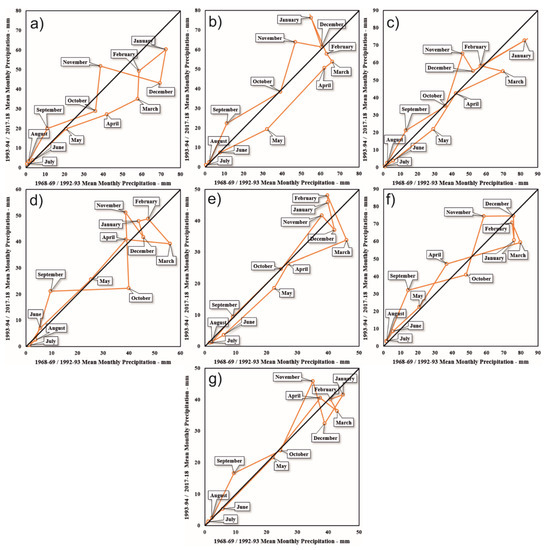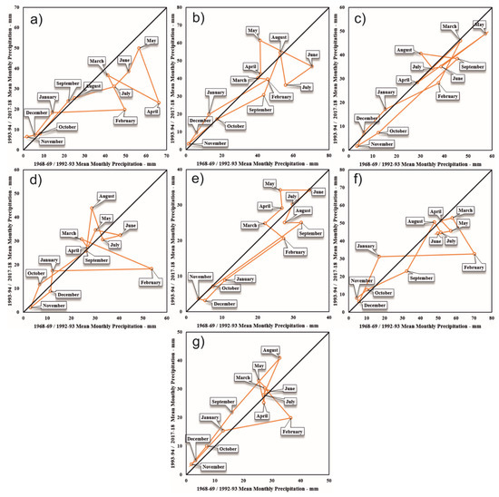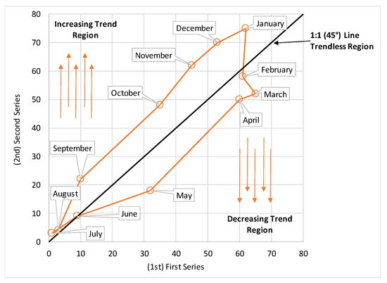 As a consequence, the transition from 1 month’s precipitation to the next is visible. Given the monthly precipitation distribution in the Cartesian system, homogeneity precipitation (single polygon) or non-homogeneity structure (multiple polygons) can be identified. Detailed information about the IPTA method can be found in Sen et al. [40].