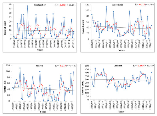 Figure 5 shows, as an example, the sums of monthly (September, December, and March) and annual precipitation in the Oued Sly station, where no statistically significant trends were detected. A figure with all the months (Figure A1) can be found in Appendix A. This variability is well shown by modeling the precipitation by a moving average (MA) of a period of 3 years. This figure shows that trends of monthly sum of precipitation are well reflected by IPTA method (Figure 3 and Table 3), with similar trend signs. Considering the monthly sums of precipitation, a high variability is visible; conversely, in the case of annual sums, seasonality of precipitation is noticeable. The statistical significance trend of monthly precipitation was detected only with the MK test, while the trend magnitude was evaluated with the Sen’s slope method. Only in the S5 station, the MK method did not detect any statistically significantly trends of monthly precipitation. In two stations, S6 and S7, located in the middle of the Wadi basin, a statistically significant trend was detected in 4 and 3 months, respectively. In the remaining stations, statistically significant trends were identified mainly in 2 months, in November and August, when the statistically significant trends were detected three times. Moreover, increasing trends were visible more often than decreasing trends. In fact, from the comparison of the results of Table 7, an increasing trend of monthly precipitations in almost all stations in September and November is evident, while in December, March, April, and May, a decreasing trend of precipitation is shown.