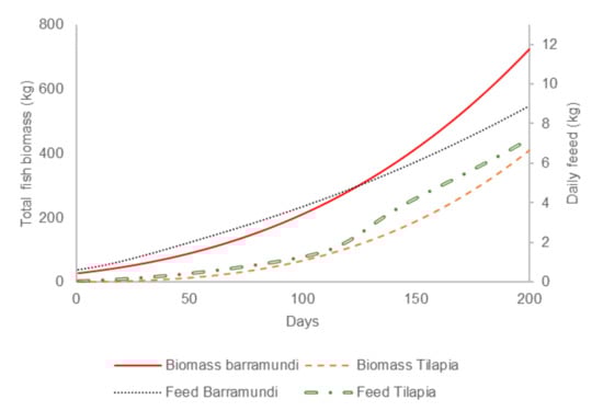 Calculating the feed input is essential as it determines the nutrient dynamics of the system. The feed requirement is determined on the basis of the fish growth model of Timmons and Ebeling (2010) []. In the model, fish growth parameters for tilapia follow from Dijkgraaf et al. (2019) [], while for barramundi, the growth parameters are presented in Appendix A, Table A1.