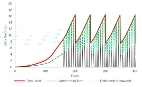 Total daily feed needed, pelletized duckweed that can be supplied from a 1350 m2 duckweed pond, and commercial feed required to cover all feed requirement in the RAS.