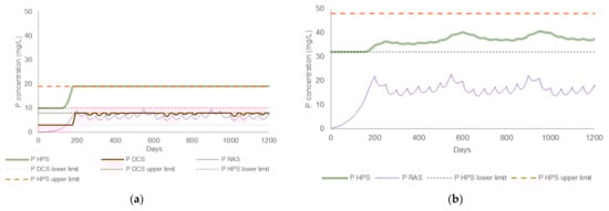 Phosphorus concentration in the RAS (50 m3), HPS (1000 m2), and DCS (300 m2) along with concentration limit of plants in HPS and DCS: (a) FW system (HPS represents rice and DCS represents duckweed); (b) BW system (HPS represents tomato).