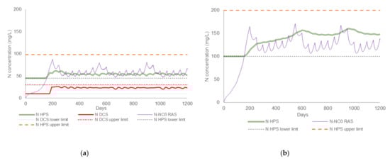 Total nitrogen concentration in the RAS (50 m3), HPS (1000 m2), and DCS (300 m2) along with concentration limit of plants in HPS and DCS: (a) FW system (HPS represents rice and DCS represents duckweed); (b) BW system (HPS represents tomato).