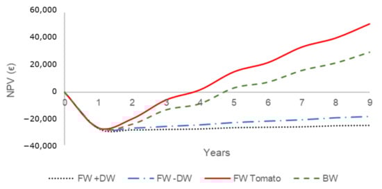 A possible way to make the BW system economically more feasible than the FW tomato system is by increasing the price of tomato grown in brackish water. Tomatoes cultivated in water with higher salinity contain higher dry matter content, resulting in a better taste than tomatoes grown in fresh water []. Hence, it seems to be realistic to evaluate a higher selling price of tomato produced in the BW system. An increase of around 20% of the selling price already makes the BW system an economically more feasible system than the FW tomato system (Appendix C, Figure A8). If there is also a chance to raise the barramundi selling price, a 20% increase makes the NPV of the BW system exceed the NPV of the FW tomato system (Appendix C, Figure A8).