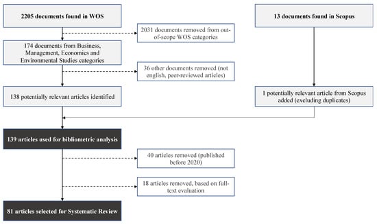 WOS displayed a set of 2205 documents, which was reduced to 174 documents when considering business, management, economics, and environmental studies as subject areas of appreciation, from which 138 are English-written articles. The same query in Scopus—applied to title, abstract and keywords—shows 13 documents, but only one of which is an article associated with the present research problem (Figure 1).
