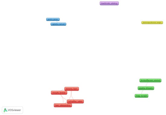Co-authorship analysis illustrates the intellectual collaborations among academics (see Figure 2), where we can find three distinct cooperative networks. One group (red colour) comprises authors located in Australia [,] dealing with the use of immersive technologies (e.g., VR) for destination experiences, in situations of over-tourism leading to deterioration of the sites. Another group (in green), aggregates researchers from different countries, such as USA, France, or England, [,,,], and deals with AI for sustainable purposes at a firm level but considering different external stakeholders. The blue group also examines AI and other related technologies, for sustainable issues (e.g., France, England, Australia, Malaysia), but more focused in internal stakeholders [,].