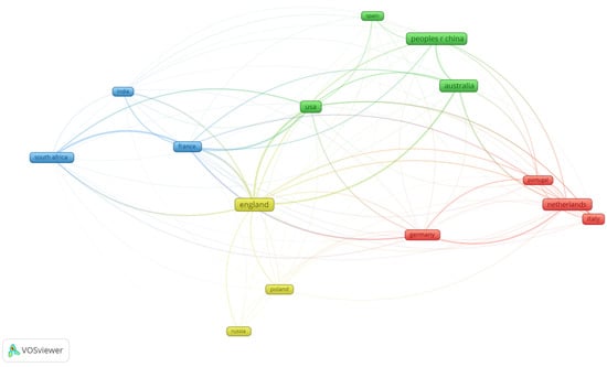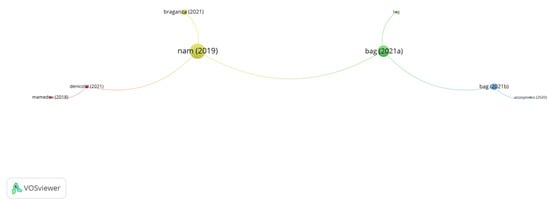 Figure 3 and Figure 4 display, respectively, the network of universities’ countries of origin, from where the first authors are affiliated to, and the network of documents. When applying bibliometric coupling technique to countries of affiliation, four major networks emerge: the two in red and yellow colours link European countries, while the other two extend their connections across universities from different continents. This analysis is conducted based on the assumption of similarity between two articles that sharing common references []. Regarding the documents’ bibliometric coupling (articles published in indexed journals), Figure 4 highlights the articles’ proximity—due to sharing similar content—and recency, where these examples exhibit a central, closely related position [,,].
