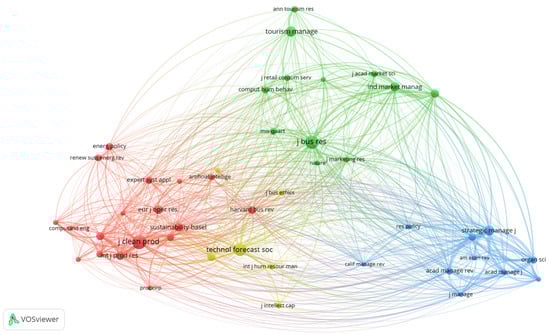 Co-citation analysis represents the number of times two secondary articles are cited together in a third article. The Figure 6 examines how often secondary journals are co-cited and reveals the network composition of journals where research is published. In each cluster, it is possible to uncover the leading journal []. In the red cluster, Journal of Cleaner Production is the most cited source, which includes articles mainly dedicated to sustainable issues. The green cluster reflects sources from the fields of management and marketing, where Journal of Business Research and Tourism Management are the most prevalent, in terms of citations and networks established. The blue cluster illustrates strategy and management journals, with Strategic Management Journal emerging as one of the most relevant. A final yellow cluster can also be visualized, with Technological Forecasting and Social Change prevailing in this niche group, intending to link technology to social issues.