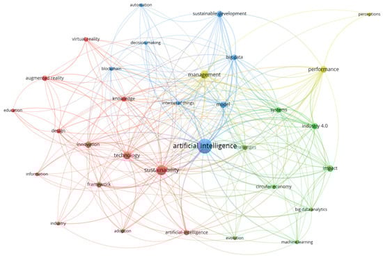 A keyword co-occurrence network represents the relationships between keywords, which reflect the main context in the literature (see Figure 7). The most prominent node is artificial intelligence (AI). This node links with others in the same cluster, such as internet of things, big data, sustainable development, or automation. The yellow network intersects the blue one, through the management and performance terms. The green network aggregates words such as circular economy and industry 4.0, with others associated with AI, e.g., big data analytics, machine learning or systems. Finally, the red network links the word sustainability with VR and AR technologies, innovation, or issues related to the adoption of such technologies.