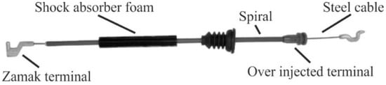 The present work focuses on the design of a thermoplastic micro over injection molding station, as part of a continuous and automatic production line of bowden cables to be applied in vehicles. An example of a complete cable is presented in Figure 1, showing two main components: the inner cable with the gripping (zamak) terminals, and the protecting outer metallic spiral, involving it for protection during operation in the vehicle. The injection equipment should receive these cables with the two main components assembled, and then either over inject the spiral plastic terminals, or over inject the bowden cable zamak terminations themselves to provide a more suitable link to the components to be actuated (e.g., noise or friction/wear reduction). With the proposed equipment, it will be possible to replace the existing injection machines (from JB Fiser®, Barcelona, Spain) in the automotive component company, which were not specifically sized for the application. Actually, these machines are tailored for larger and heavier parts, thus having much bigger dimensions than necessary, with the corresponding repercussions in the assembly line layout, while the energy consumption is not adjusted to the current standards. Moreover, the proposed over-injection machine design should be adapted to ensure a fast integration in currently running assembly lines of bowden cables production, enabling the increase of efficiency.