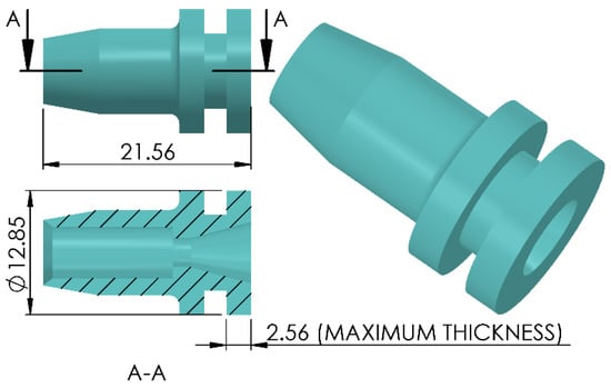For design purposes, it was necessary to define the component to be over injected, namely concerning the injection volume. Thus, Figure 2 shows the plastic terminal considered for this purpose, used to calculate the injection volume, and required closing force for the mold. This terminal is representative of the components to be injected, and at the top of expectable demands, for both volume mold force. The equated materials by the company for this process are either high-density polyethylene (HDPE), low-density polyethylene (LDPE), polyamide 66 (PA66), or polyoxymethylene/polyacetal (POM). This component has a total injection volume of 1.1483 cm3, and the company targets for a maximum single-part injection time of 6 s, calculated to prevent the machine from serving as bottleneck to the process. In fact, it is considered that the production line can consistently prepare the spiral/cable sets for injection with 6 s intervals, and feed the injector at the same rate.