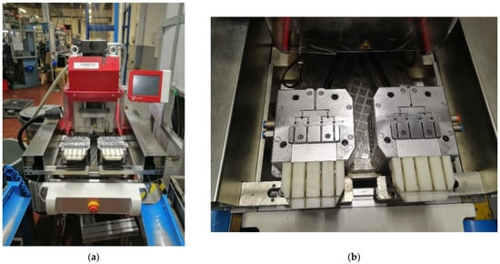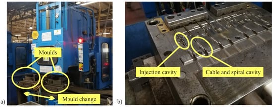 Presently, in the company, the terminal over injection process is accomplished using oversized over injection machines by JB Fiser® (model VMCC 80/200) (Figure 3). The setup requires one dedicated operator for each injection station. Additionally, the bowden cables’ fabrication line is not continuous, and the cable fabrication operations are separated, leading to time consumed by the operators to move the product between stations. As previously mentioned, one of the motivations for the present work is to create an integrated production line for bowden cables, like the ones presented by Moreira et al. [27] and Figueiredo et al. [28], and cancel these activities that do not increase added value to the product. In the over injection workstation, each machine is linked to two molds, and the dedicated operator manages the two molds. While one mold is injecting, the operator should remove the over injected cables and place new cables for injection in the other mold. Switching between operations is carried out by side moving the two molds, semi-automatically by manual input from the operator, as shown in Figure 3a. Figure 3b shows the mold details, including the cable and spiral cavities, to inject several parts simultaneously, and the injected terminal cavities, where the molten plastic will be poured into.