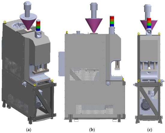 The final design of the assembled over injection machine is represented in Figure 5 and Figure 6, including isometric and side views. The global dimensions of the machine (ready-to-use) are: 2938 mm (height), 1632 mm (length), and 753 mm (width).