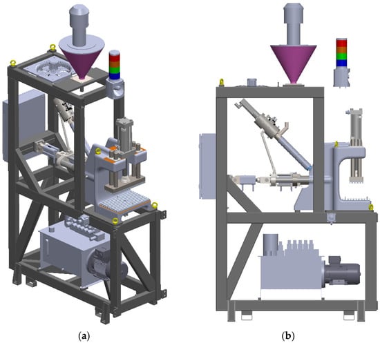 General representation of the injection machine without the panels: isometric (a) and sides views (b).