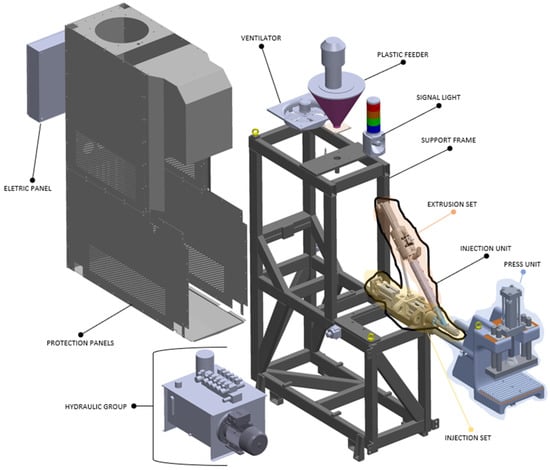 All the subsystems that constitute the over injection machine are represented in Figure 7 using an exploded view. A brief description is made in this section to understand the subsystems that compose this equipment, and respective working principle. Further details, including the design solutions, are given in Section 4.3 and Section 4.4 on the three main systems of the machine: press unit, injection unit (divided into extrusion set and injection set), and hydraulic system. The machine’s working principle is described as follows: the mold cavity is fixed into the press subsystem and injected with molten plastic coming from the injection unit, which is composed by the injection and extrusion set, and plasticizes the plastic material. Opening and closing of the mold cavity are operations controlled by the press unit. The base frame, built from welded structural rectangular tubes, aggregates the equipment’s subsystems. The hydraulic group powers the cylinders that perform the desired movements. This equipment was idealized to connect to the client factory hydraulic circuit, but if the client does not have a self-hydraulic circuit or if the equipment is commercialized as ready to use equipment, then a hydraulic group (represented in Figure 7) is used to control the hydraulic cylinders. In order to help the feeding of the equipment with plastic grains and avoid moisture and contamination in the plastic, an automatic vacuum-based feeder system is used, which fills the hopper with plastic, isolating it from the surrounding air. A system of temperature and humidity sensors is included to control an extractor fan that extracts the fumes and hot air from inside the machine and keeps the equipment environment controlled. This type of equipment works with high temperatures and vapors coming from the humidity in the plastic, causing a high probability of fire. Thus, to avoid the spread of fires coming from the equipment and/or alert the factory in such case, a light signal with the machine status and a siren are part of the standard equipment. Protection and enclosure panels are used to make this equipment safe, avoid dust accumulation in vital parts and prevent workers from being injured. Holes in the panels let fresh air come inside the machine to control the environment and keep an acceptable temperature. The electric circuit is managed inside an electric box behind the equipment.