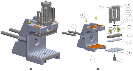 This section details the subsystems of the injection machine, depicted in Figure 7, namely the press unit, the injection unit, which is composed by the extrusion set and the injection set. The hydraulic group is described separately in Section 4.4. Figure 8 shows the press unit along with its components. In order to be able to make the necessary 7.5 tons of force, the press unit has an 8-ton force capacity hydraulic cylinder. To fix the mold halves, two T-slot plates are used. As the machine must withstand high mold closing loads, small misalignments can give rise to non-negligible transversal loads, and since the opening and closing speed of the mold is not significant, four brass bushings were used to guide four hardened shafts. The bushings are equipped with two cleaning seals, preventing dust from entering the friction zones with the shafts, which could damage both the shafts and bushings. Additionally, two hardened shafts are fixed to the rear of the press unit to promote sliding of the injection unit in order to promote the contact between the injection nozzle and the mold. To facilitate the production of the press unit, its structure is made of grey cast iron, minimizing the raw material cost and facilitating the associated milling operations. The highlighted components of Figure 8 are the following: 1–structure of the press; 2–extruder + injector assembly guiding shafts; 3–transportation rings; 4–ejection cylinder; 5–lower mold table with T-slots for mold fixation; 6–upper mold table with T-slots for mold fixation; 7–mold opening base; 8–adapter of cylinder 11 to base 7; 9–graffitied bronze bearing; 10–scrapers to clean dirt particles and dust from columns 12; 11–cylinder to open and close the mold; 12–guiding columns; and 13–bearing cover and housing of the upper scrapers.