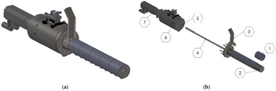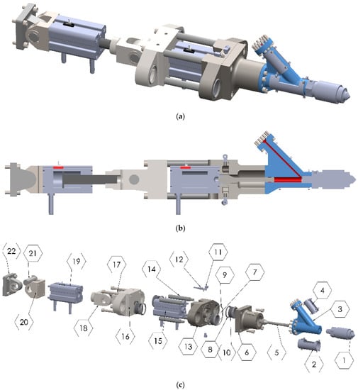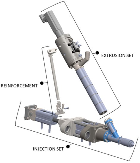 The injection set (Figure 12) injects the plasticized material into the mold. With this purpose, the injection unit has two hydraulic cylinders, one to inject the plastic itself and another to push the entire injection unit until the injection nozzle contacts the mold. The full set of components depicted in Figure 12 are defined as follows: 1–injection nozzle; 2–electrical resistance to heat the injection chamber; 3–connector between extruder and injector; 4–electrical resistance to heat the flow channel; 5–injection piston; 6–refrigerator assembly cover; 7–inner sealant; 8–scraper; 9–outer seal; 10–polymer bearing; 11–cooling water c supply connection; 12–temperature sensor; 13–body of refrigerator assembly; 14–spacer columns; 15–injection cylinder; 16–backrest cylinder support to the extruder set; 17–pin; 18–backrest cylinder support (16) adapter; 19–backrest cylinder; 20–backrest cylinder mounting adapter; 21–pin; and 22–adapter to attach to the injector structure.
