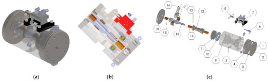 The extrusion set uses in its rear a power unit (Figure 11) that provides the torque (to induce screw rotation) and axial load (to advance the screw), in order to plasticize the plastic material and shut-off the screw, preventing the plastic from retracting to the plasticizing cylinder when it is not being injected into the mold. The components that constitute the power unit are as follows: 1–dynamic sealant; 2–lid of cooling assembly; 3–gasket of the cooling assembly, placed between components 2 and 4; 4–body of cooling assembly; 5–nozzles to insert grease into the bearing; 6–temperature sensor; 7–cylinder pushing spindle; 8–cylinder adapter for lever 16; 9–housing body of components; 10–inner locking nut to protect the outer ring of the bearing; 11–four-point angular bearing; 12–bearing support; 13–outer locking nut for tightening of the inner bearing rings; 14–brass bearing; 15–closing shaft that transmits rotation and translation to the spindle; 16–lever; 17–semi brass rings; 18–brass bearing; and 19–adapter to fix the electric motor.
